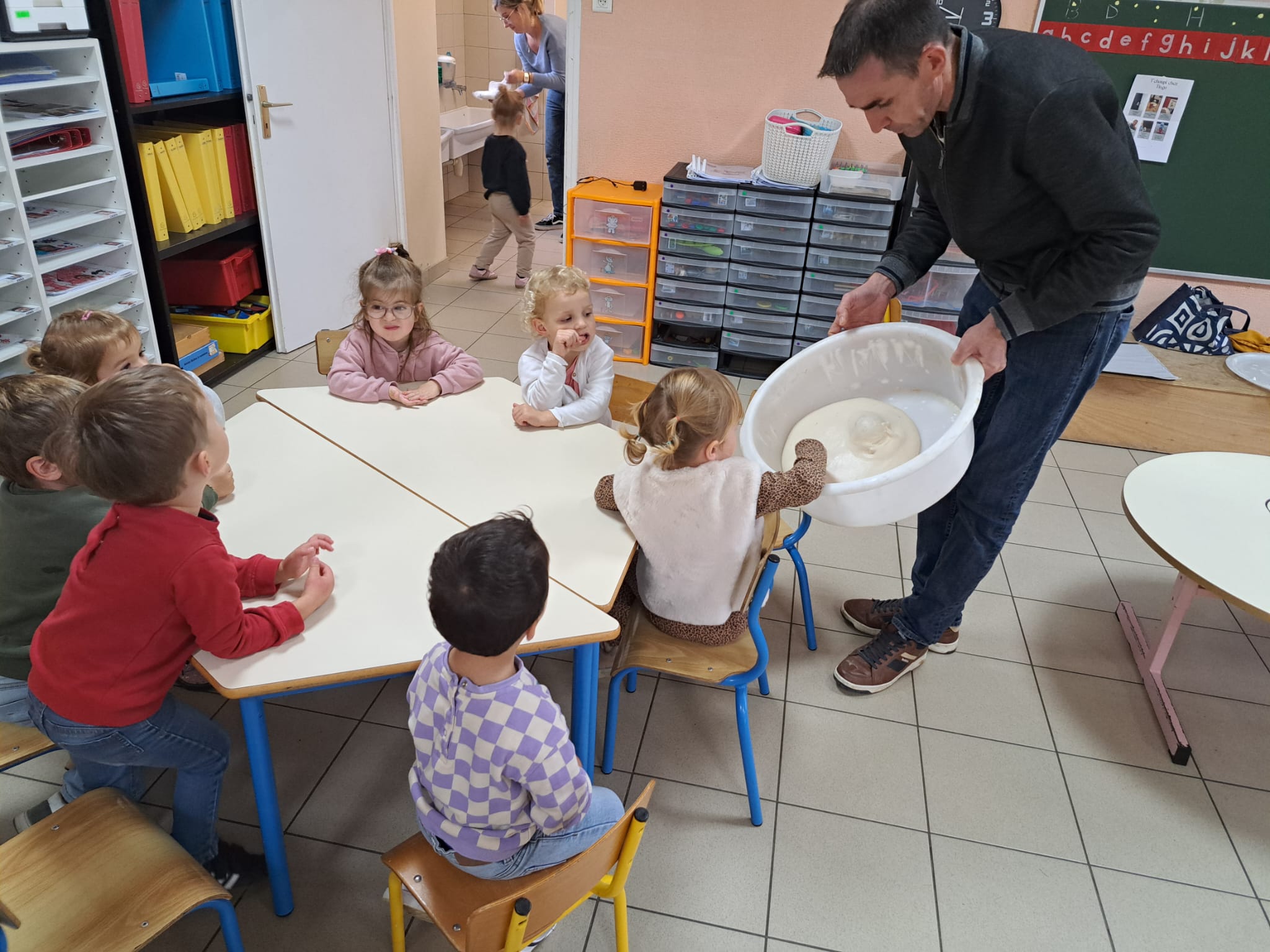 Après avoir lu un documentaire sur la fabrication du pain et retenu le nom des 4 ingrédients ( Farine, Sel, Eau et Levure), les PS ont accueilli OLIVIER qui est boulanger et Papa de 3 élèves de l’école. Nous le remercions d’avoir pris sur son temps personnel pour venir dans notre classe.