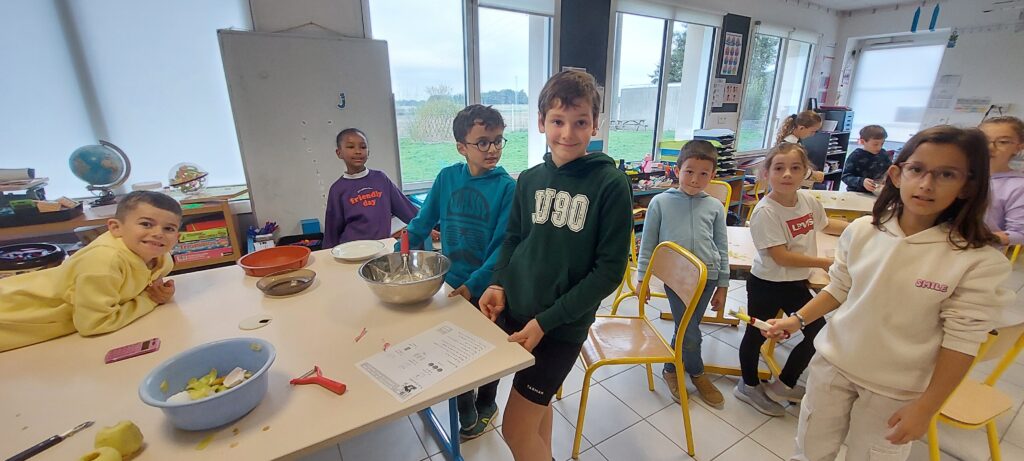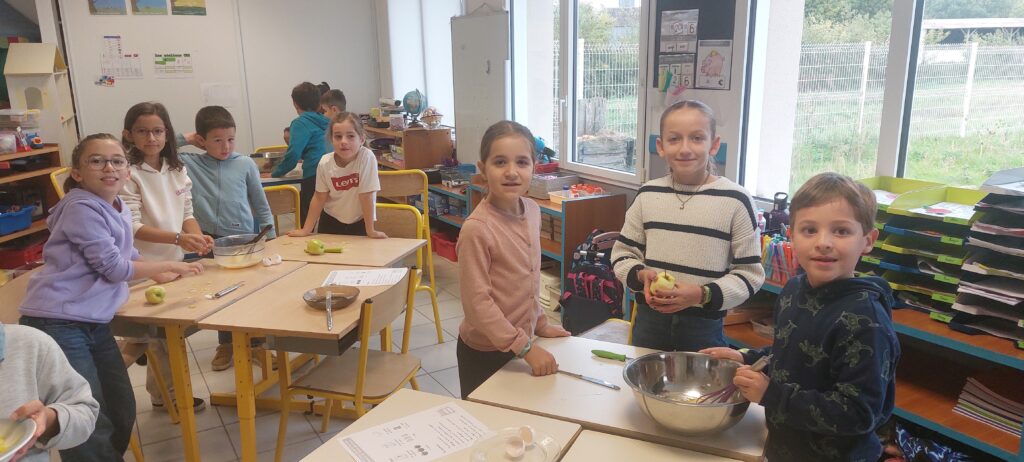 Pour la semaine du goût, nous avons fait une recette de gâteau aux pommes avec notre classe binôme.
