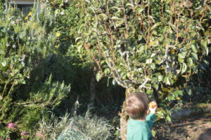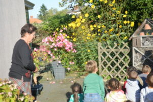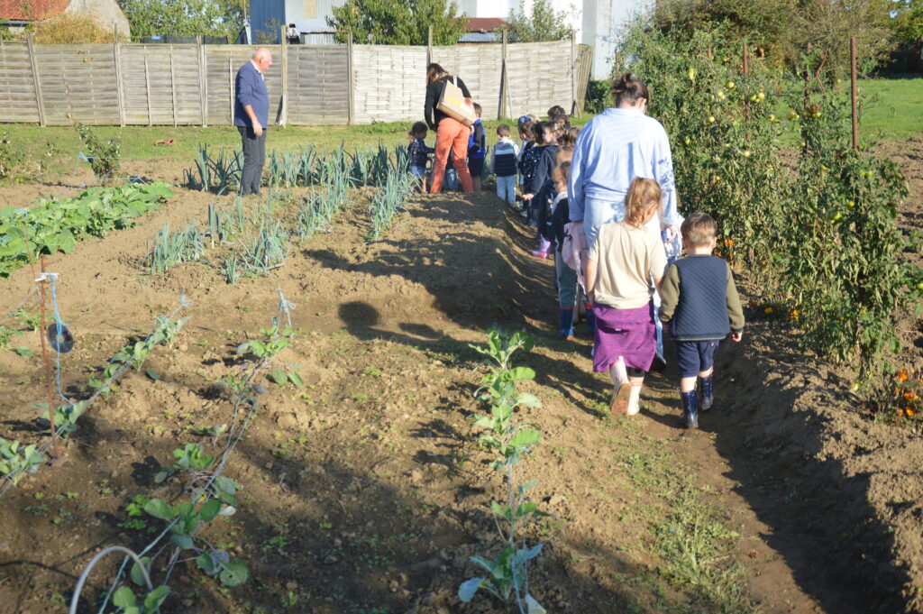 Après avoir pris leurs bottes, les élèves de maternelle sont partis à la découverte des jardins de Christiane et Christian. Ils ont pu observer les fruits, les légumes, les fleurs. Christian a également pris le temps de présenter les outils indispensables aux jardiniers.