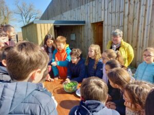 Jeudi 19 mars, les cm sont allés visiter les jardin de la Genette à St Georges de Montaigu. Mathieu, un des chefs de l’exploitation nous a expliqué que si la ferme portait ce nom, c’est parce que la nuit, la genette, un félin cousin du chat, sort tout près de l’exploitation. C’est un animal sauvage duquel on peut voir les traces mais il reste très difficile à observer.
