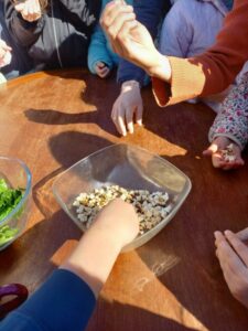 Nous avons terminé la visite par une dégustation de légumes de saison (radis, carottes, épinards) ainsi que du pop corn à parti du maïs produit sur place.