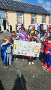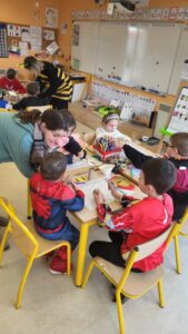 Pour célébrer le carnaval, nous avions revêtu nos plus beaux costumes. La matinée s’est déroulée avec plusieurs ateliers : fabrication de maracas, d’un masque, écoute d’une histoire, réalisation de panneaux pour le défilé.